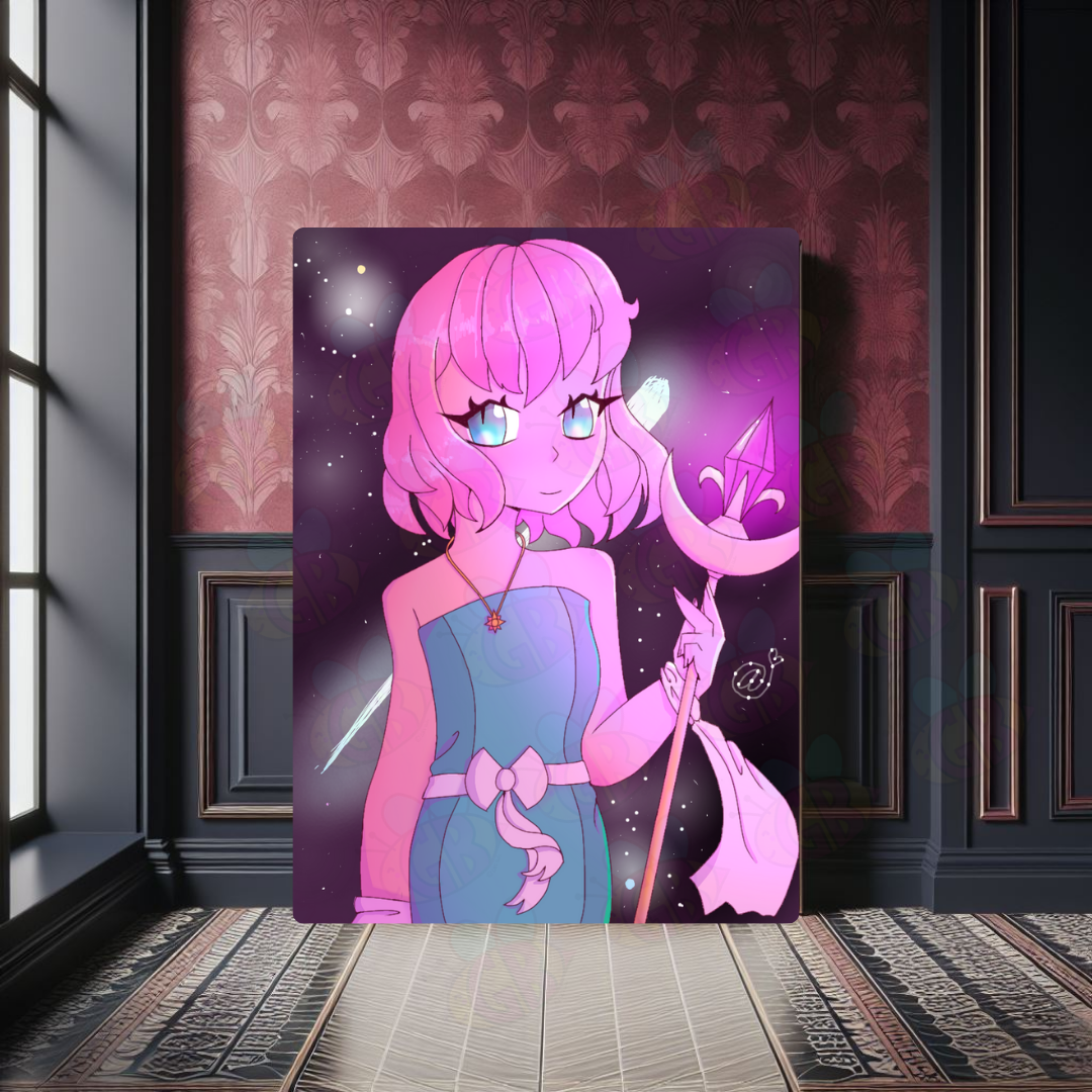 Framed artwork of an anime-style young woman with pink hair and a blue dress, holding a sword, in a room setting. She is a warrior princess, moon art