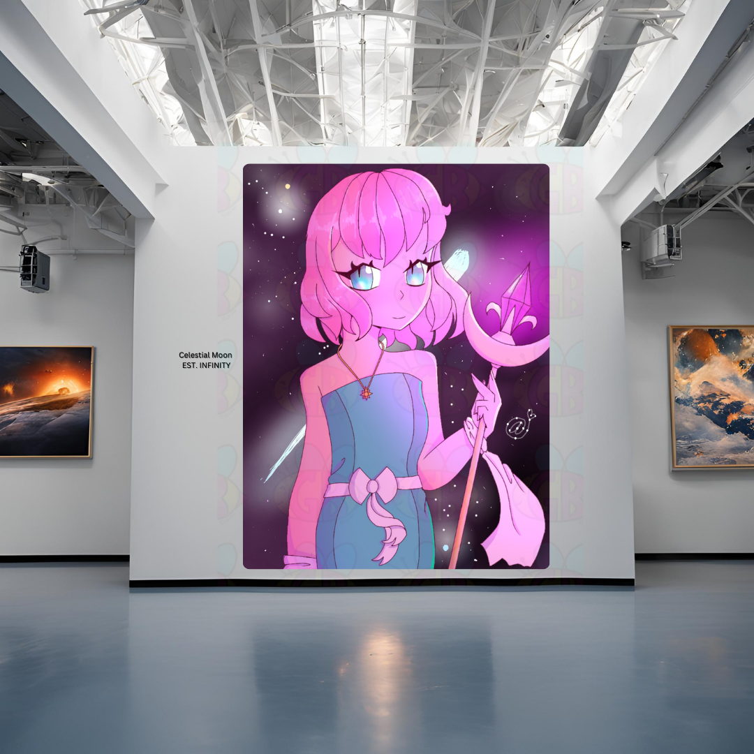 Celestial Moon is a bold and mystical artwork featuring a young woman with flowing pink hair, standing strong beneath the moonlit night sky. With a gleaming sword in hand, she radiates courage, femininity, and ethereal beauty. The glowing moon behind her and cosmic hues of blue and violet create an enchanting aura, making this piece a statement of both strength and serenity.